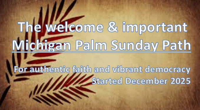 The Michigan Palm Sunday Path, like that of other states, has now started. It is part of the Lighthouse Project Palm Sunday Path, supported by United Church of Christ Conferences. All together, it is a nationwide protest action against authoritarianism and…